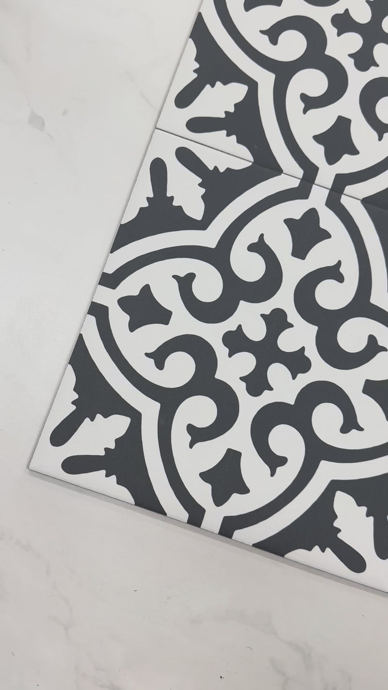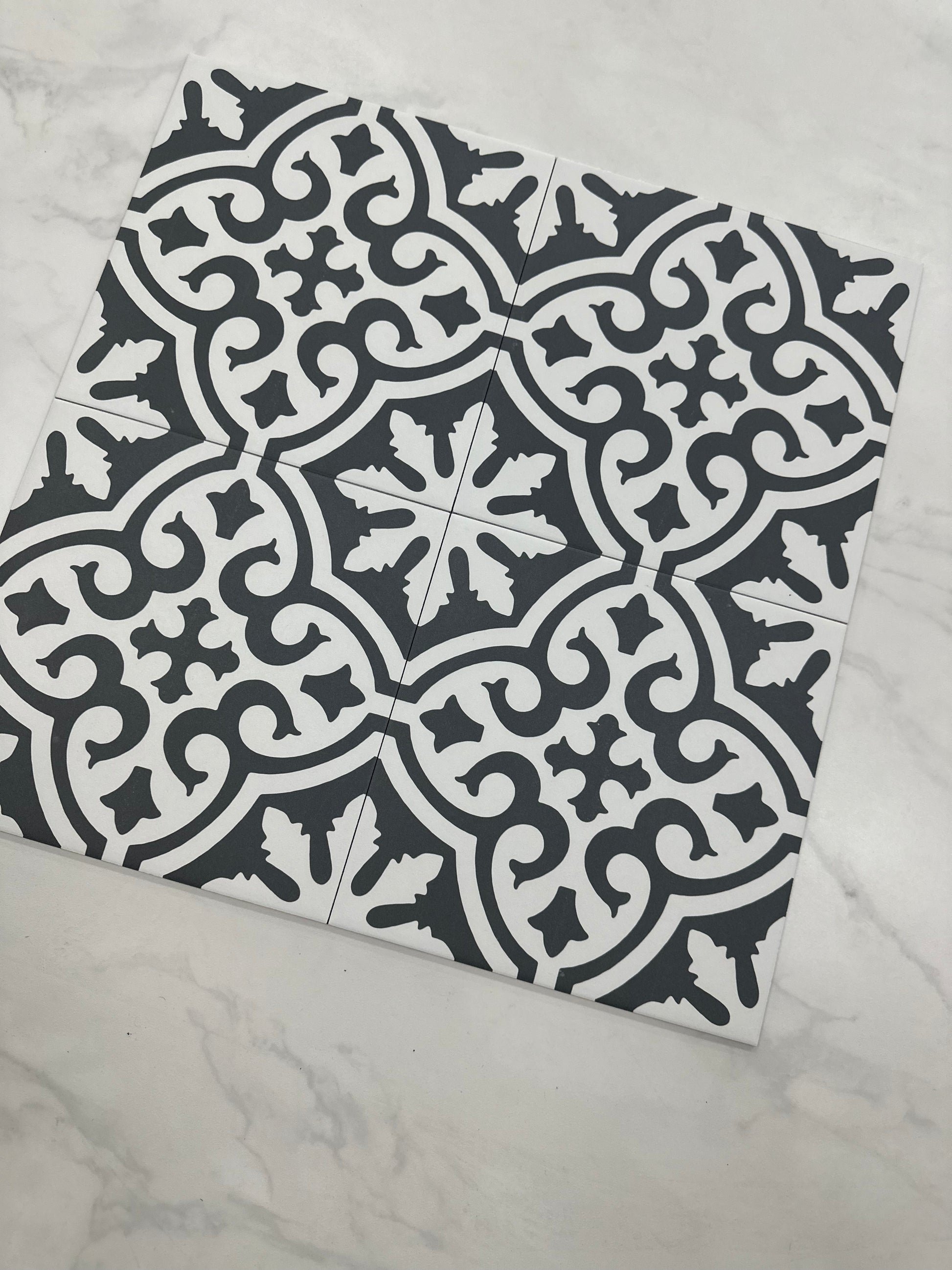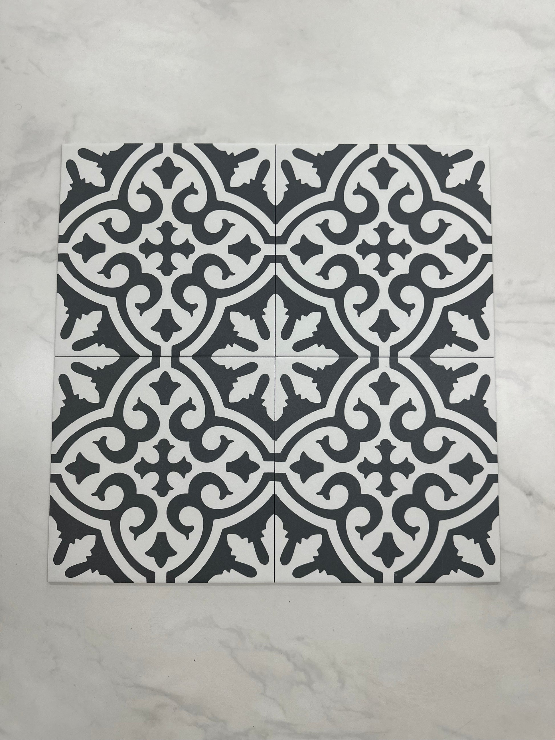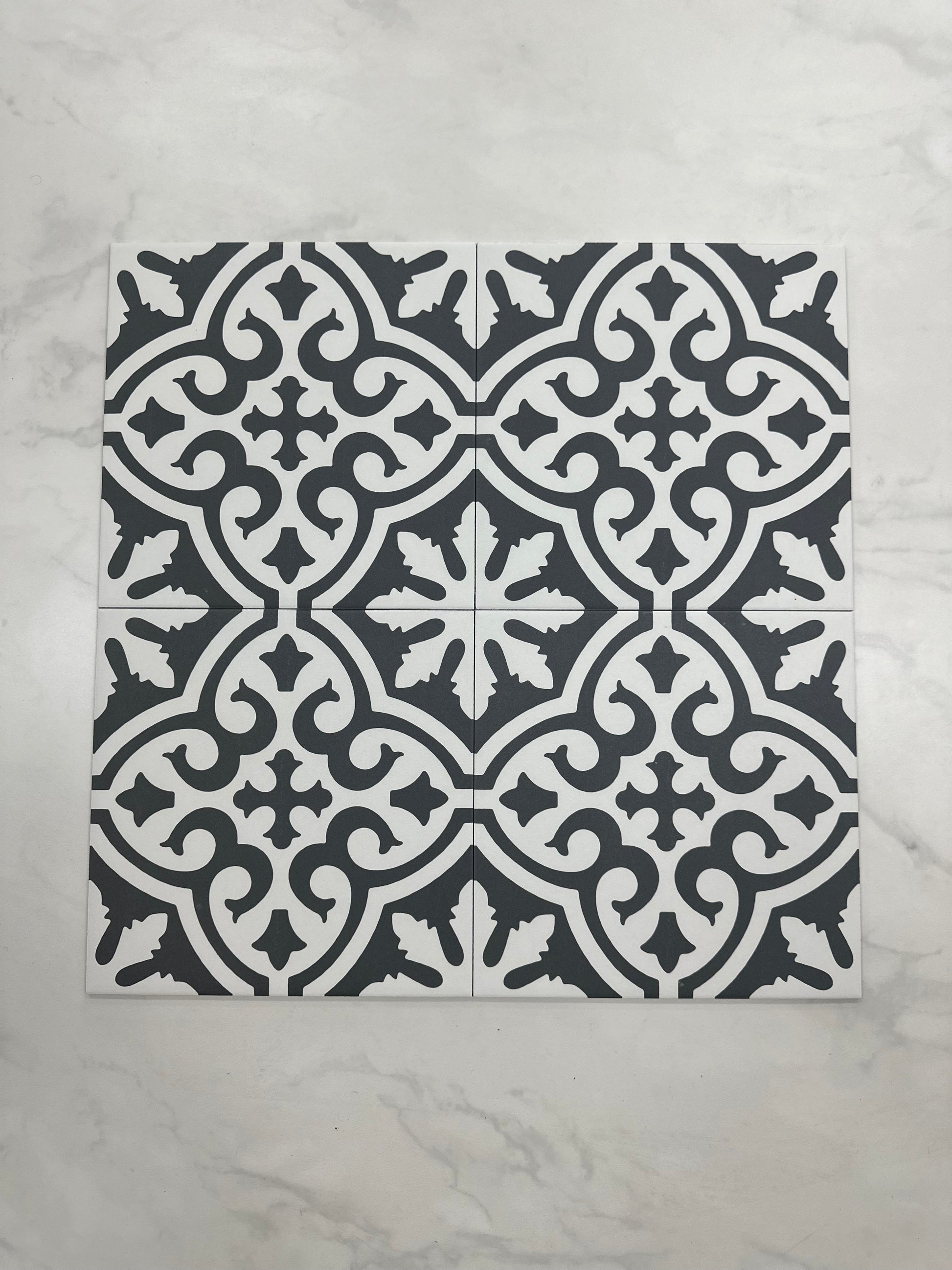 Create a bold, timeless feature with the Glenmore Charcoal Pattern Tile. Showcasing a classic ornamental design in deep charcoal and white, this tile delivers strong contrast while maintaining a refined, elegant feel. The symmetrical pattern adds depth and movement, making it ideal for both traditional and contemporary spaces.